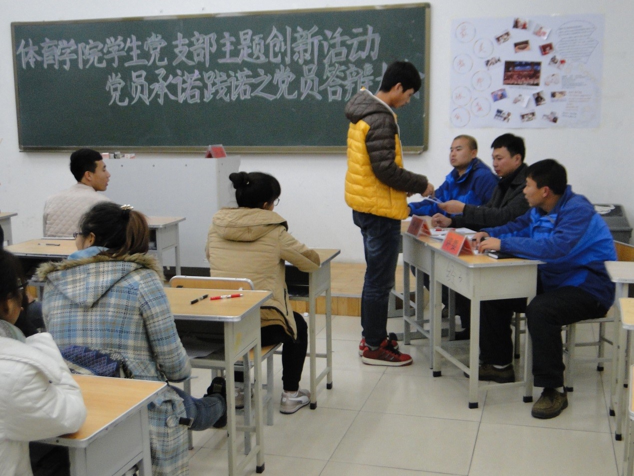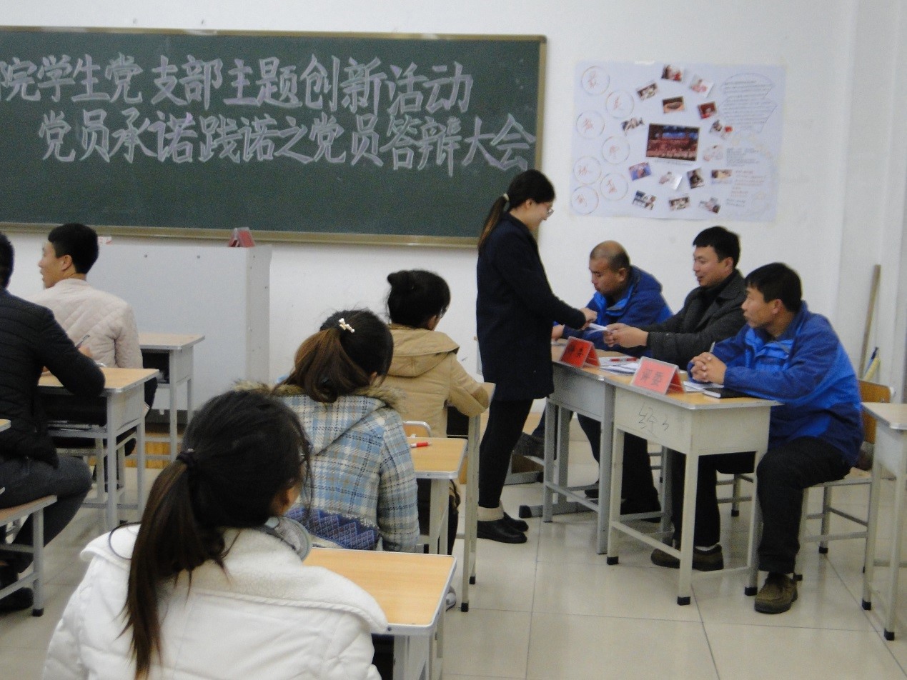 1946伟德国际源自英国员工党支部在开展了系列党小组学习,完成了党员“承诺践诺”研讨会的基础上, 2015年12月16日在主楼123召开了员工党员“承诺践诺”答辩大会,会议由员工党支部书记孙波主持,全体2012级、2013级党员及预备党员参加了会议。员工党员从20道题中任意抽取一题上台进行答题,并结合自己的实际情况进行讲解。答辩推进会现场气氛热烈,每位党员受益匪浅,具有一定的教育意义。