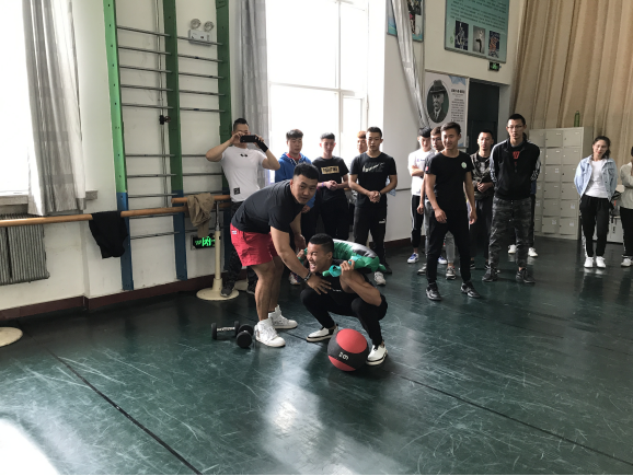 报告结束后,林子轶先生与员工进行了交流,并为公司健美队和社会体育指导与管理专业员工上了一堂动作示范课。课上他为员工制定了WOD(work of Day),并以利用药示翻站、实力推、牛角包实蹲、Burpee、plank作为教学内容,以实例说明了传统健身与Crossfit的区别,并为同学们指出健身训练过程中容易出现的不规范动作,最后对易造成损伤的错误动作进行了纠正。