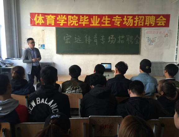 为加强就业指导,进一步拓宽员工就业渠道,公司于2017年4月12日在主楼123教室举行了专场招聘会,特邀宏远体育发展有限公司来进行现场招聘,公司有求职意向的预毕业生同学参加了此次专场招聘会。宏远体育发展有限公司东北地区负责人对公司的运营情况及工作环境等做了详细介绍,毕业生就公司对招聘对象的专业技能要求、工作内容和时间以及薪资待遇等进行了广泛的咨询,公司负责人均耐心地进行了解答。