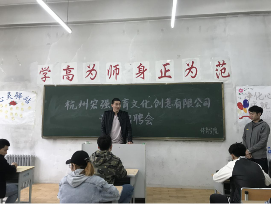 本次大会由导员陈鑫主持,杭州宏强体育文化创意有限公司创始人吕滋强先生介绍了公司的规模和招聘人员范围,对员工在实习和转正期间的各项待遇做了说明,提出希望可以招聘到善于沟通、思维清晰的优秀员工,尤其是有担任过员工会和社团组织干部经历的员工,这样的员工往往阅历比较丰富,更容易融入到工作中去。